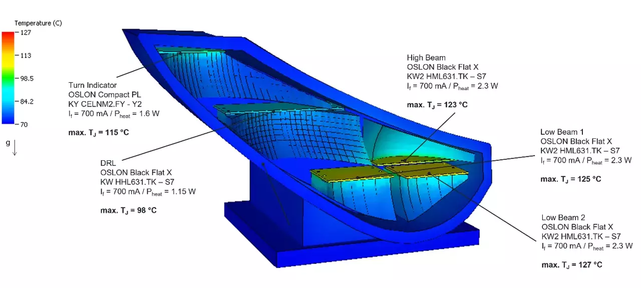 The headlights and DRL produce light output compatible with automotive lighting standards: at a junction temperature of 150°C and a drive current of 700 mA, each OSLON Black Flat X chip produces 270 lm. In these conditions, it consumes 2.0 W, and dissipates 1.15 W of thermal power. The thermal performance of this forward lighting unit is illustrated in Figure 4.