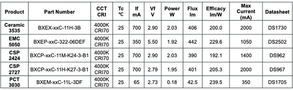 The Ceramic 3535, EMC5050, and CSP2424 families are fully qualified and in volume production. Samples and evaluation boards are available immediately, with standard lead times for production quantities.