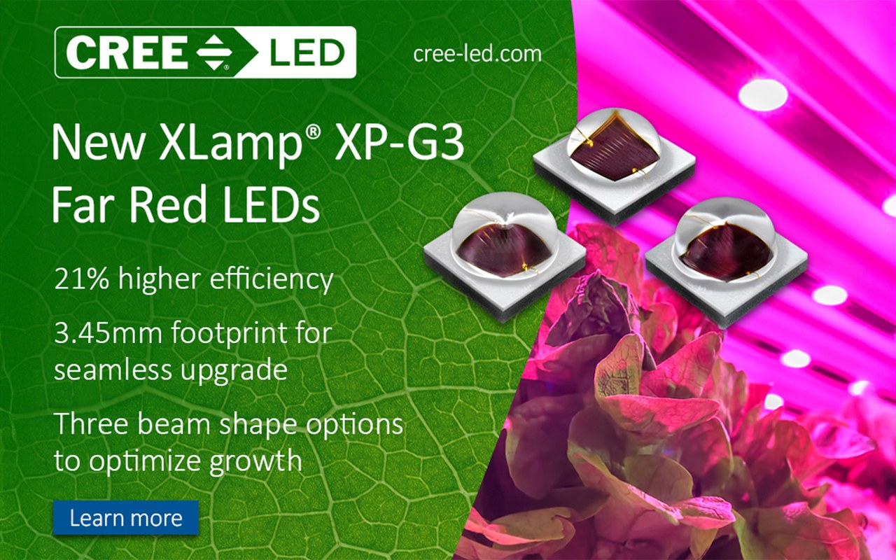 Cree LED is expanding its industry-leading horticulture portfolio with the introduction of the XLamp® XP-G3 Far Red LEDs, engineered to deliver exceptional efficiency, superior reliability and seamless system upgrades for horticulture lighting manufacturers.