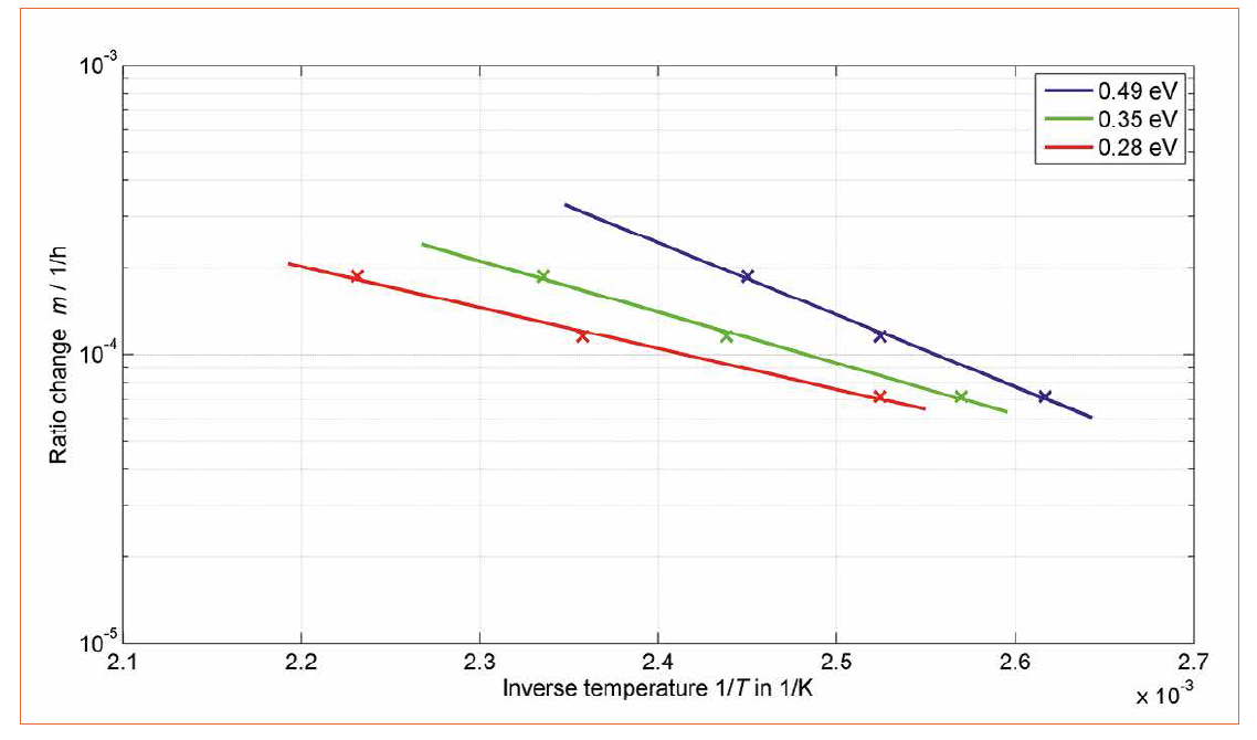The blue points represent the lowest temperatures as the inverse temperature is represented on the x-axis. Activation energies EA can be determined out of the slopes, the absolute temperature and Boltzmann constant. Depending on the estimated temperatures, they are in a range from 0.3 eV to 0.5 eV. That is why the exact temperature is very important for knowing the real aging mechanism’s activation energies. One presumption is that the silicone matrix gets brittle over time. Accelerated aging tests of silicone encapsulant show that the elongation at breaks decreases by the factor of 10 after 4,000 hours at 225°C [4].