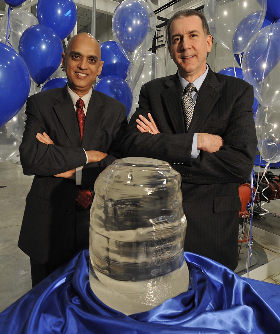 Rubicon Technology, Inc. executives Raja Parvez, President and CEO (left), and William Weissman, CFO (right), celebrate the first sapphire boule from the new Batavia, IL facility. (Photo: Business Wire)