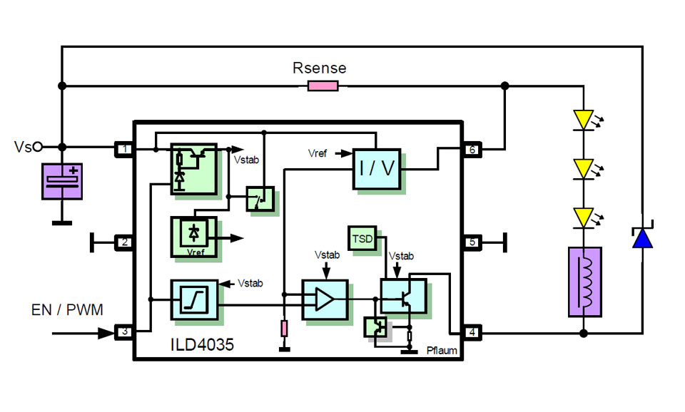The typical application circuit using Infineon's ILD4035https://www.led-professional.com/media/products_led-driver-ics-modules_ild4035-2013-step-down-led-driver-for-1w-leds_ild4035-buck-led-converter-typical-application/viewhttps://www.led-professional.com/media/products_led-driver-ics-modules_ild4035-2013-step-down-led-driver-for-1w-leds_ild4035-buck-led-converter-typical-application/@@images/image-1200-ab5f074dd85ab5513702ae1339db573c.jpeg