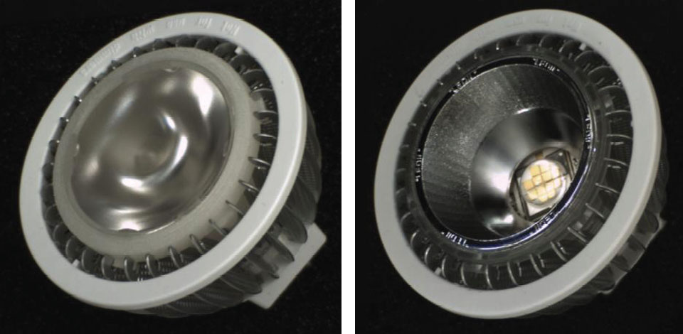 MR16 assembly using the XLamp MT-G LED (left: Carclo TIR optic, right: Ledil reflector optic)