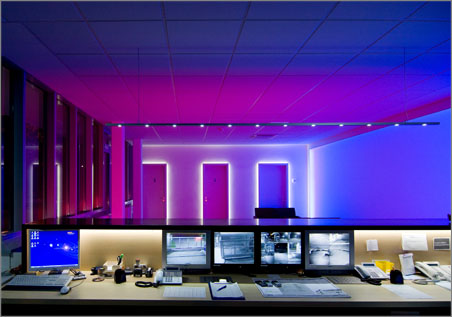 Workspaces can also be lit ergonomically with LEDs, by backlighting monitors, for example. Apart from this, color LEDs can also achieve interesting effects (Source: OSRAM).https://www.led-professional.com/media/project_news_general-lighting_osram-opto-semiconductors-reception-building-is-lit-entirely-by-leds_os_oso_reception2-jpg/viewhttps://www.led-professional.com/media/project_news_general-lighting_osram-opto-semiconductors-reception-building-is-lit-entirely-by-leds_os_oso_reception2-jpg/@@images/image-1200-71e77a11e5126e1cc5f6ff10219d01c2.jpeg
