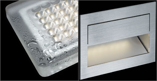 Q 36 Aqua (left): Ceiling or wall surface-mounted luminaire with an extremely low mounting depth of only 10 millimetres for outdoors and wet rooms. Mike India(right): Classical wall flush-mounted luminaire made of brushed stainless steel and installed near the floor for floor lighting with a power consumption of only 8 W.