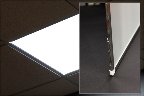 This 23.5” x 23.5”” troffer downlight features a slim, lightweight backlight assembly (inset) that is edge-lit with high efficiency LEDs that focus the light into a high-performance light guide.