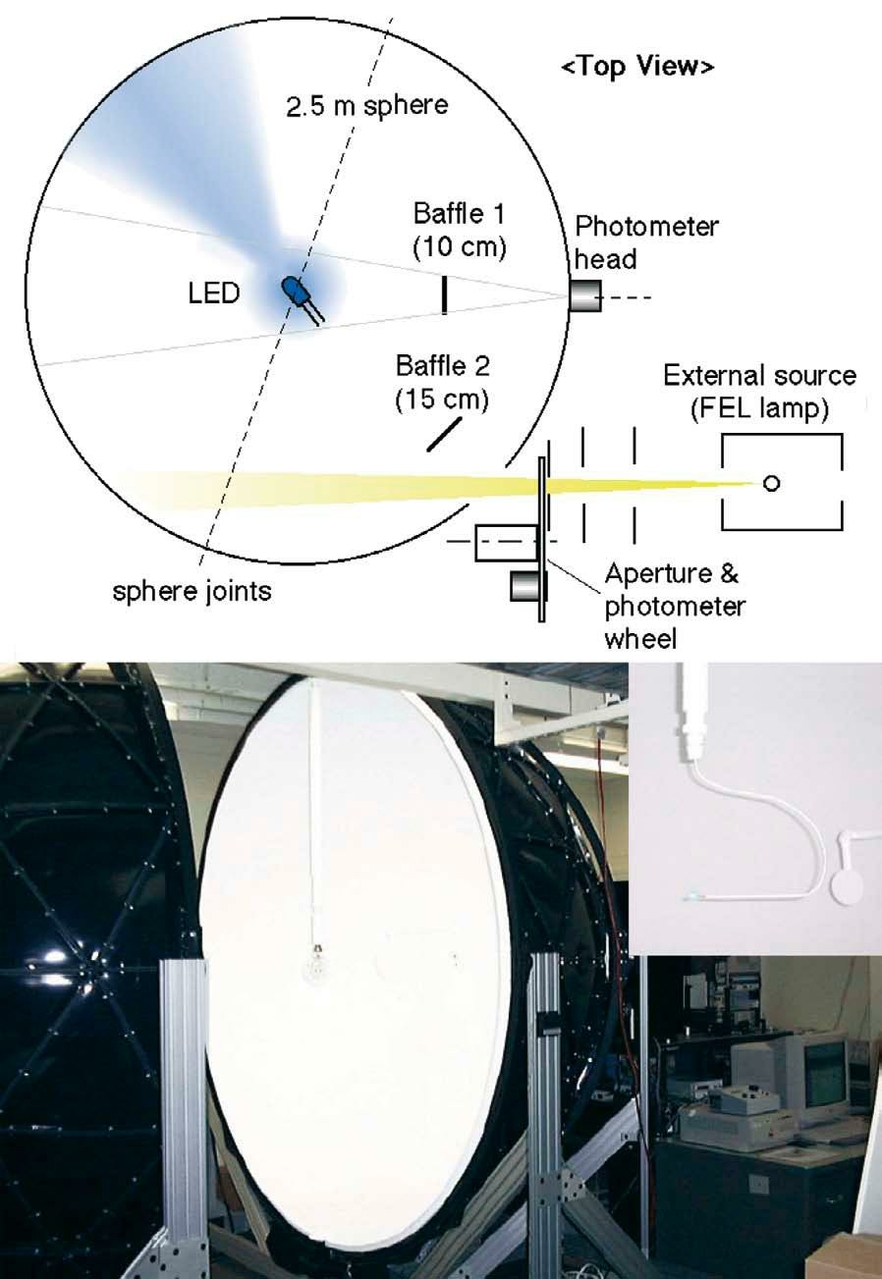 Figure 3: NIST 2.5 m integrating sphere configured for LED measurements (above) and the picture of the sphere with an LED holder (below).https://www.led-professional.com/media/resources-1_articles_measurement-of-leds_measurment3-jpg/viewhttps://www.led-professional.com/media/resources-1_articles_measurement-of-leds_measurment3-jpg/@@images/image-1200-b94b95d2c336d7f12ce6257548f59531.jpeg