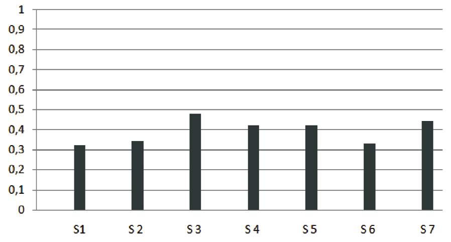 Figure 2: Power Factor values of the tested LED bulbs. X-axis: S1 to S7 showing numbers of the tested samples.