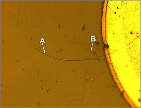 Micrograph of a complete nanowire LED. The long nanowire (A) is about 110 micrometers long, a shorter nanowire (B) crosses it. The circular section is the metal post from which the nanowires are aligned.