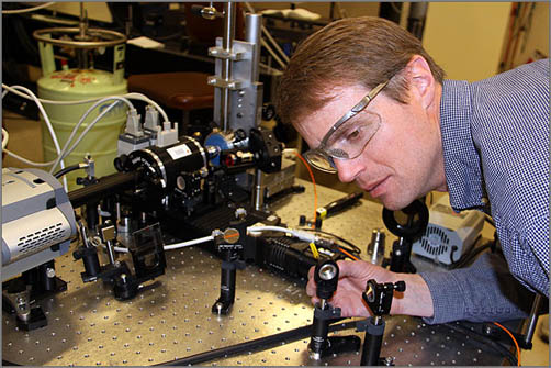 NREL Senior Scientist Brian Flugel adjusts mirrors to set up an experiment aimed at testing the quality of a green LED. Credit: Bill Scanlon.