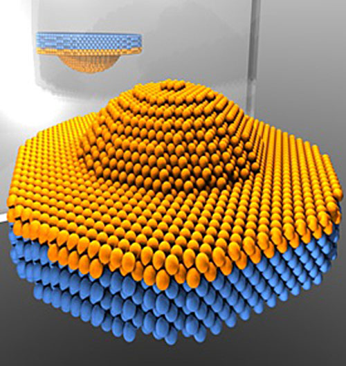 Quantum dots are solid-state ”artificial atoms” that are made up of thousands of atoms (yellow spheres) embedded in a semiconductor (blue spheres). Despite this complexity, the photon emission properties of quantum dots were hitherto believed to be like traditional atoms, where a point-emitter description is sufficient. Due to their mesoscopic dimensions, however, the point-emitter description is revealed to break down by comparing photon emission from quantum dots with opposite orientations relative to a metallic mirror.