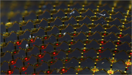 Stretchable micro-LED display, consisting of an interconnected mesh of printed micro LEDs bonded to a rubber substrate. (Photo by D. Stevenson and C. Conway, Beckman Institute, University of Illinois).