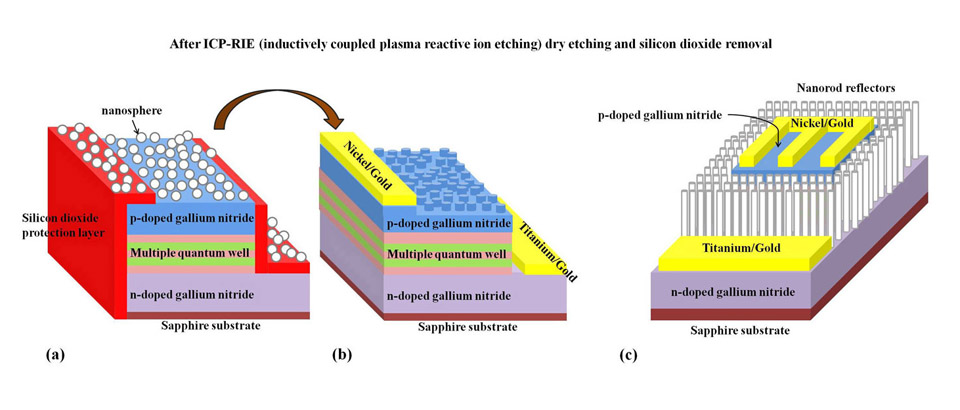 Figure 2. Roughening of the p-doped GaN surface using nanosphere lithography. (a) The nanospheres are first spin-coated onto the sample, followed by dry etching to define patterns. (b) The silica spheres and protection layer are then removed. The device-fabrication process is completed following deposition of contact metal. (c) Structure of an LED equipped with nanorod reflectors.https://www.led-professional.com/media/technology_light-generation_using-nanostructures-to-improve-led-light-emission_roughening-of-the-p-doped-gan-surface-using/viewhttps://www.led-professional.com/media/technology_light-generation_using-nanostructures-to-improve-led-light-emission_roughening-of-the-p-doped-gan-surface-using/@@images/image-1200-d9bc57833920225f9fd06a2a560bdd58.jpeg