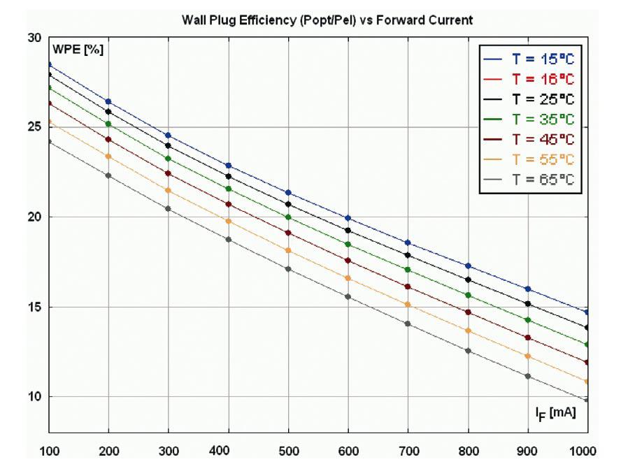 Figure 4: Current and temperature dependence of the WPE of a red Dragon LED (measured by Mentor Graphics MicReD).https://www.led-professional.com/media/technology_standardization_on-the-standardization-of-thermal-characterization-of-leds_standardization4-jpg/viewhttps://www.led-professional.com/media/technology_standardization_on-the-standardization-of-thermal-characterization-of-leds_standardization4-jpg/@@images/image-1200-d9bc57833920225f9fd06a2a560bdd58.jpeg