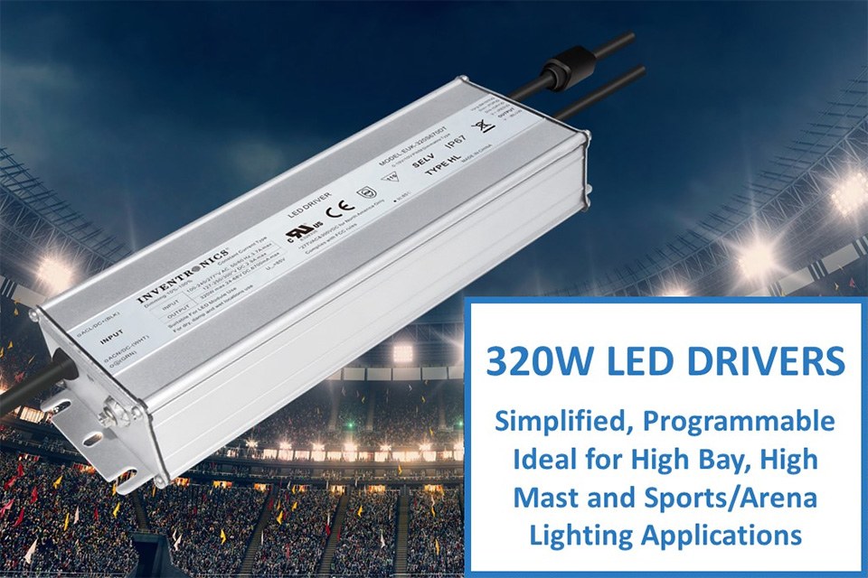 Inventronics has expanded their EUK family of programmable, constant-power and IP67 LED drivers to include models at power levels of 320 W. These new models are in addition to already extensive power level range which includes 75 W, 96 W, 150 W, 200 W and 240 W models. The EUK family is well suited for applications that do not require enhanced features such as always-on auxiliary power, controls-ready features or multiple timer dimming capabilities. By optimizing the features including isolated 0-10 V and 10 V PWM dimming, there is now a more cost-effective product that still offers design flexibility, high efficiency and a reliable performance.
