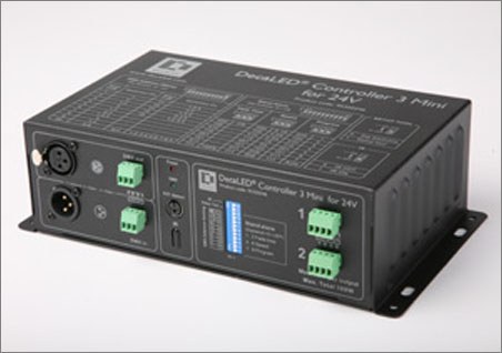 The DecaLED® Controller 3 Mini is a small version of the DecaLED® Controller 3 and the lightest of all 24VDC controllers. The Controller 3 Mini is a professional led controller for led products with a 24VDC input. The DecaLED® Controller 3 Mini is suited for powering and dimming of all 24VDC led products and can handle a maximum load of 6Amps, with a maximum of 3Amps per output. The controller is 243 x 150 x 73 mm and needs a input voltage of 230VAC. The DecaLED® Controller 3 Mini is delivered with a remote controland an external infrared eye. With these accessories and the dipswitches it is possible to select a diversity of standard programs, colours and effects. The Controller 3 Mini is also equipped with professional XLR 3 connector and screw terminals for DMX signals.
