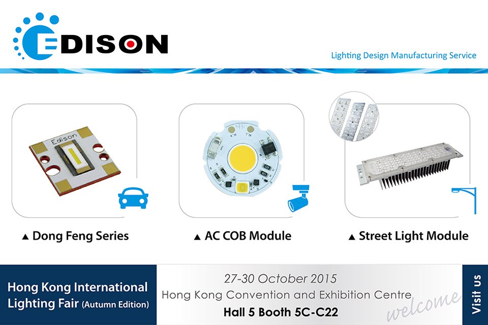 Edison Opto will launch new AC modules with smart lighting control system, street light modules with multiple angles and the latest automotive LEDs at Hong Kong International Lighting Fair (from Oct. 27 to Oct. 30, 2015). All the new products will make its debut in this event. We invite you to visit us at booth 5C-C22 in Hall 5, and experience the latest developments in LED lighting technologies.