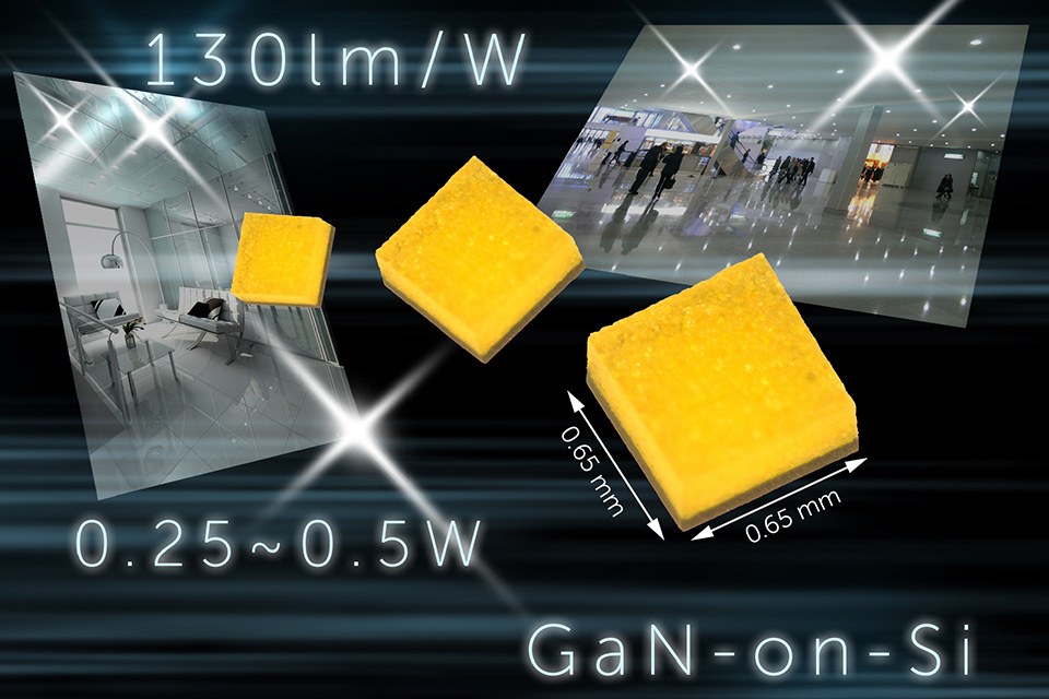 The new products utilize gallium nitride-on-silicon (GaN-on-Si) process technology and a new process technology that fabricates the elements of a packaged LED on an 8-inch silicon wafer. The LEDs are the industry’s smallest in sub-watt class (0.25 to 0.5 W) white LEDs[2], with a package size of just 0.65 x 0.65 mm, but they achieve a luminous efficacy of 130 lm/W[3] and superior heat dissipation. Forward current is up to 180 mA (max.).