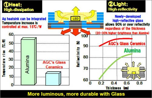 In July 2010, AGC (Asahi Glass Co., Ltd.) will start sales of a new glass-ceramics substrate that enables high-brightness and high-durability for LED lighting. This new glass-ceramics substrate will expand LED applications in the lighting and illumination sector, including 3D televisions and automotive lighting, in which high-power output is increasingly in demand.