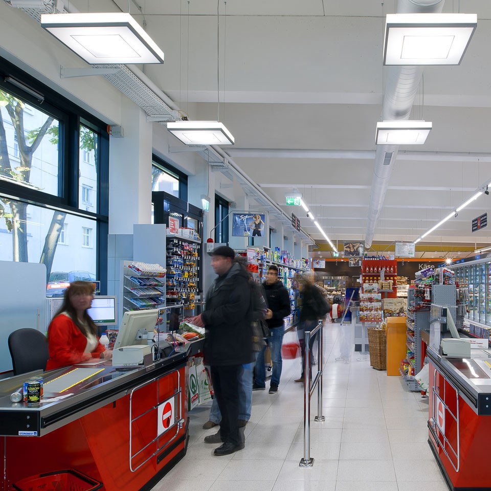 The cash point areas are additionally illuminated by square LED luminaires. Arranged consistently above the individual aisles, they facilitate orientation. Even for side rooms and emergency lighting, LED luminaires were chosen. The Panos Infinity LED downlight is over 70% more efficient than downlights fitted with conventional compact fluorescent lamps. As to the Resclite LED emergency luminaire, the client benefits from its low installed load.