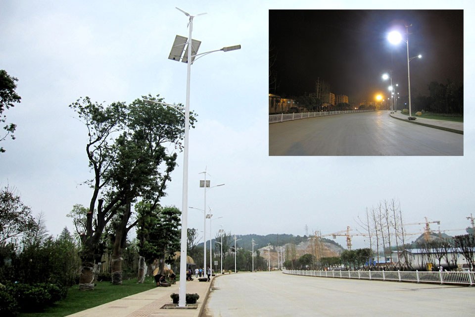 Now, the naming district Guiyang city solar & wind hybrid led street light projects have check and accept successful. We use sustainable resources wind and solar in this project, which is high efficiency, environmental, energy saving and long life-span. We adopt one pole with two lamps design, one lamp is large one 240W, the other one is much smaller, say 60W, in this system, we also input the time control and light control digital system, we saved both manual labour and material resources in this project, and we produce the best possible results of the local weather, which is sufficient sunlight in summer, sufficient wind in winter. After all the installation work done, we checked all the conditions, customer give us a big praise for the obvious energy saving.