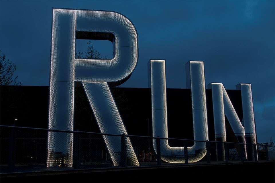 RUN comprises three nine-metre tall letters, each weighing about 15 tonnes, which have been installed slightly offset, one behind the other, on the elevated plaza in front of the new Copper Box Handball Arena. The giant letters consist of mirror-coated glass panels mounted on steel structures. Hence, in daylight, the entire surface produces a mirror effect, and these everchanging reflections of its immediate surroundings – the sky, the park, people, buildings – make the sculpture virtually dissolve, so that it seems to merge with its environment in a surreal way. When night falls, the sculpture's appearance changes: thanks to LED luminaires installed inside, along the outlines of the letters, and controlled by light sensors, the luminous letters clearly stand out against their environment. Convex mirrors installed on the inside and invisible in daylight transform the individual LED strings into a scintillating mass, which conveys to the structure an unexpectedly strong, yet light-weight spatial presence. Indeed, both the “elegantly psychedelic effect at night” (Monica Bonvicini) and the dissolution due to the mirror effect by day form a striking contrast to the sheer size and massiveness of the letters.