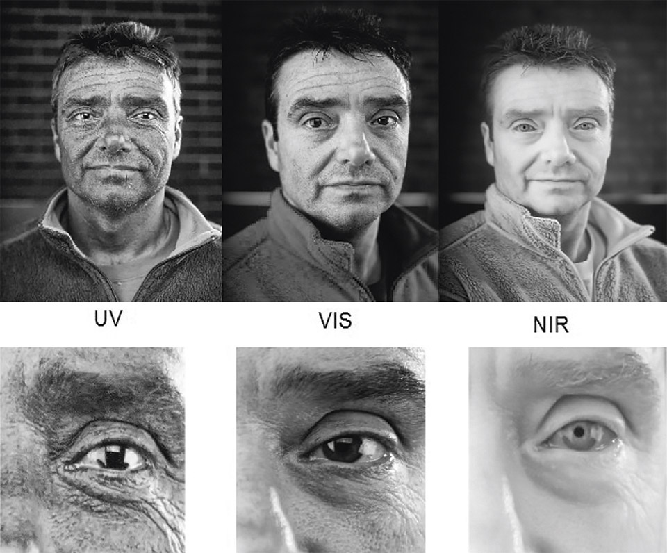 Figure 3: The UV, VIS, NIR pictures show the differences in eye absorption. The sclera (white of the eye) strongly reflects VIS light but is 4 times more transmissive to NIR Credits: Nick Spiker, www.nikespiker.com) - For comparison reasons the images are unified to gray scales