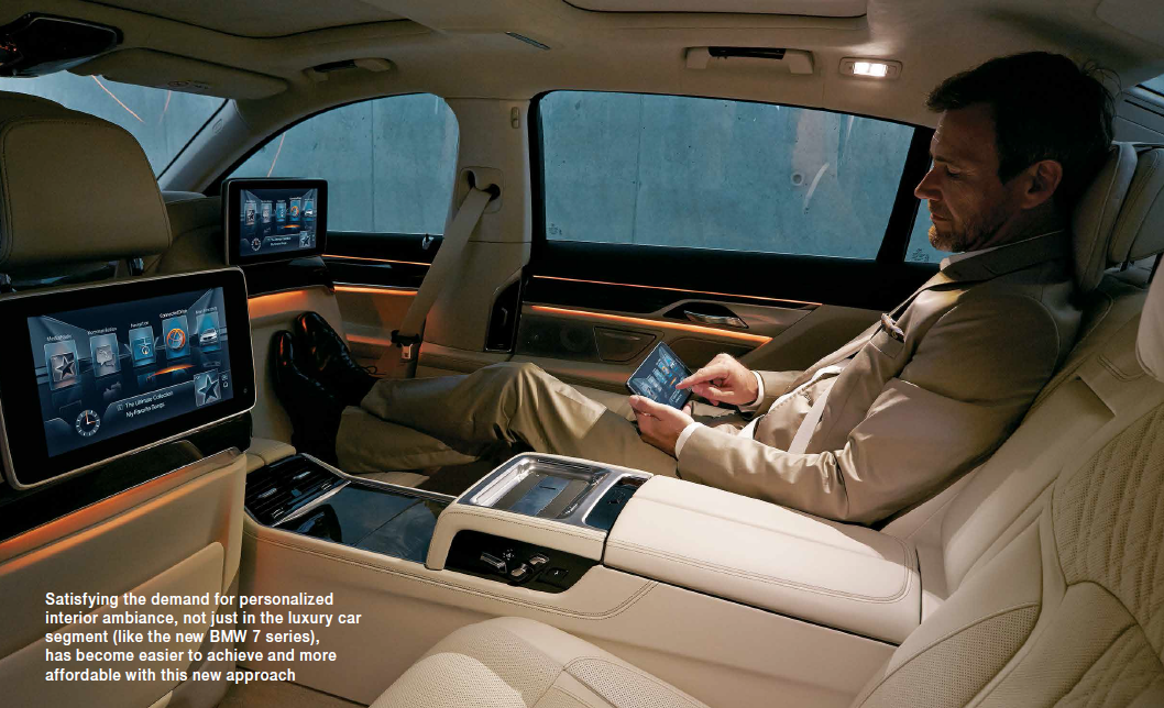 In recent years, LED-based technologies have become an accepted, and increasingly, an expected standard for high-end premium in-car lighting. Nevertheless, there exist significant limitations to the way LEDs are controlled, which has thus far hindered their extensive implementation throughout the car interior. As it stands, current state-of-the-art 'ambient light' technology typically consists of a multicolor LED feeding into an optical fiber (Figure 1).
