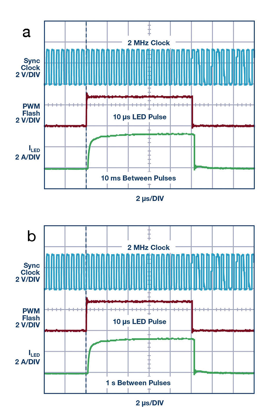 One challenge in all of these systems is creating the very high current and short-term (microseconds) LED camera flash waveforms, which can be spread out over long periods of time, such as 100 ms to over 1 s. Creating short, square LED flash waveforms separated by long periods of time is nontrivial. As the drive currents for the LEDs (or strings of LEDs) rise above 1 A and the LED on-times shrink to microseconds, the challenge increases. Many LED drivers with high-speed PWM capabilities may not efficiently handle long off-times and high currents for short amounts of time without degradation of the square-type waveform needed for proper high-speed image processing.