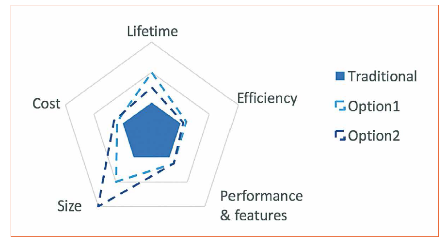 The benefits of VHF power converters push the boundaries of power converters. The trade-offs done for traditional converters are, however, still relevant, as some parameters can still be improved further if the specifications for others are relaxed. The main optimization parameters are generally size, efficiency, reliability, cost and performance. A specific driver design can either use all the advantages of VHF to improve one or two parameters, or spread the improvement across all parameters as indicated in the spider web in Figure 6.
