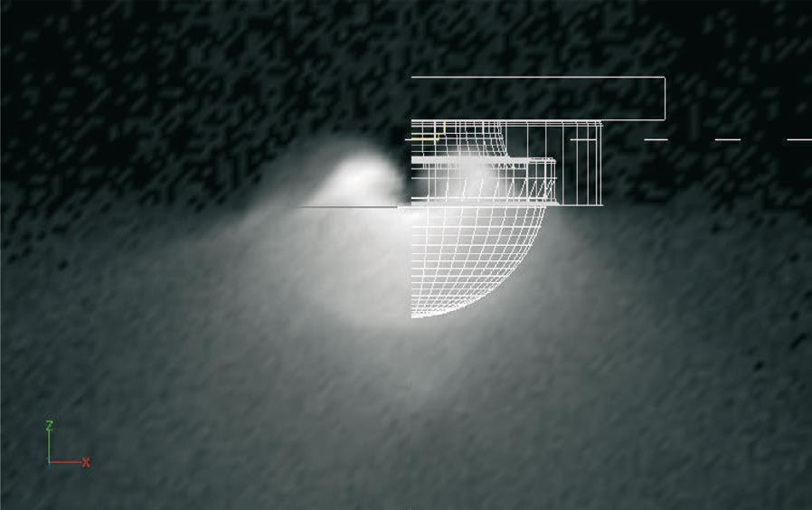 To illustrate the differences in the way rays are generated between a Type 3 and 1 model, Figures 3 and 4 show the CREE XR-E LED model which is included in the Photopia software library. The left side of each image shows the light field inside the LED while the right side shows the source geometry. In the Type 1 model, the geometry is only for reference as it is not part of the model. The location of the LED chip is near the top of these images, just above the bright region of light in the Type 3 model image.