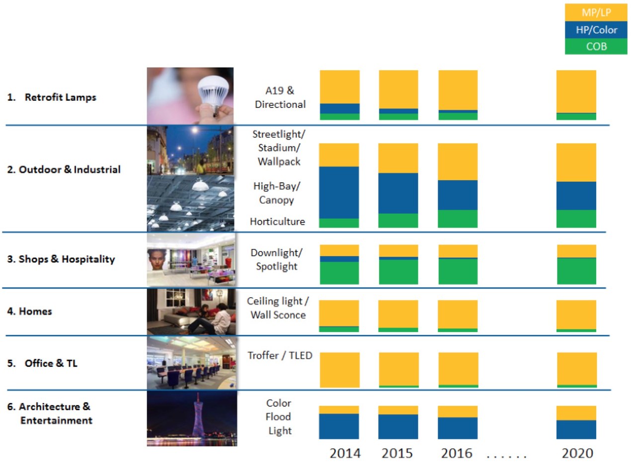 Figure: Evolution of MP/LP, HP/Color and COB products for different applications. Source: Lumileds