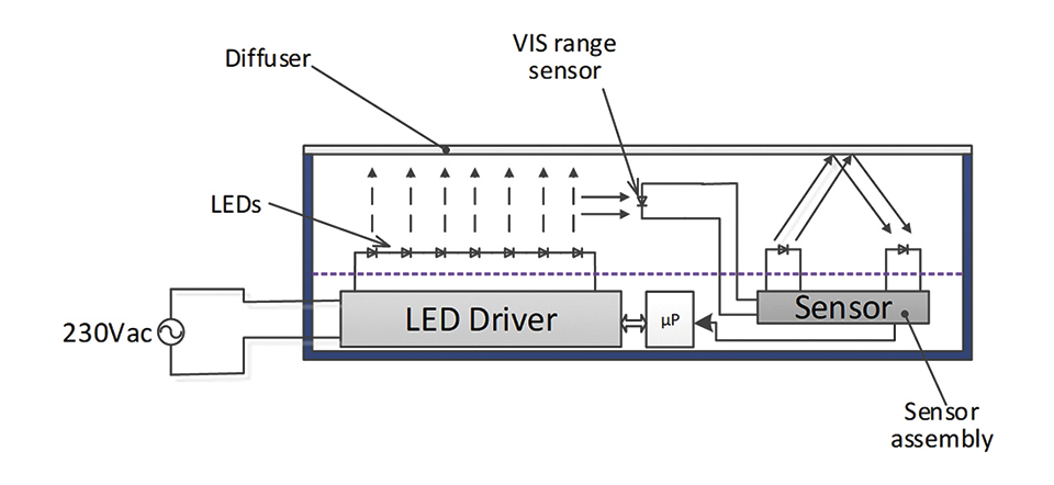 Such a BLO system could be employed inside of a LED luminaire, consisting in principle of a body / assembly as the luminaire’s heatsink having a transparent screen or light diffuser and a LED light source (Figure 7). The light generated by the LED emitters is monitored by a sensor assembly that ultimately controls the power supply driver via a microprocessor. The sensor assembly consists of an IR-infrared emitter-receiver pair, which together detects the transmission through the screen/diffuser. Measurement of the light output generated by the LED emitters inside of the luminaire is performed by a visible VIS sensor.