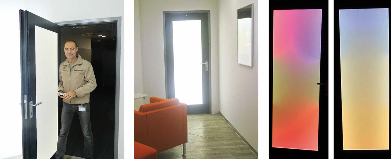 Figure 4: Luminous door with two light emitting sides. Examples of homogeneous daylight as well as of a colored pattern is shown