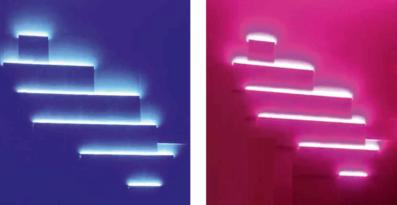 The side emitting design of the “Wedge” luminaire was especially suitable for light arrays, where multiple panel configurations allowed design freedom. Together with the variability of color temperature and color combinations an infinite number of scene settings can be achieved. A selection of different settings, which were chosen for the installations, is shown in figures 6 and 7.