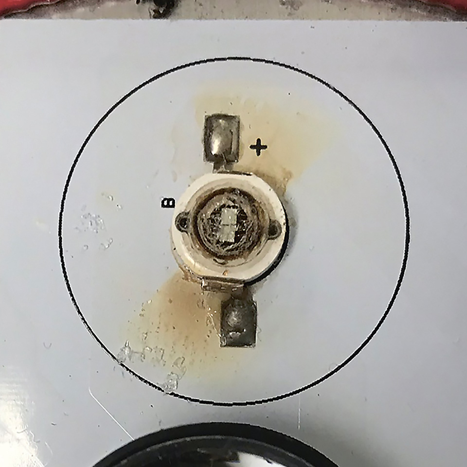 Figure 4: Example of an LED destroyed by heat trapped within the lens