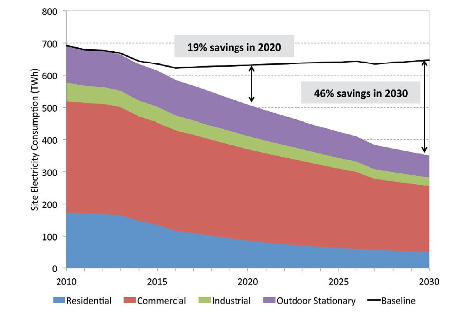 • Over the 20-year analysis period, spanning 2010–2030, the cumulative energy savings is estimated to total approximately 2,700 terawatt-hours, representing approximately $250 billion at today’s energy prices. Assuming the electric power plant generating mix is held constant over the next two decades, these savings would reduce greenhouse gas emissions by 1,800 million metric tons of carbon.