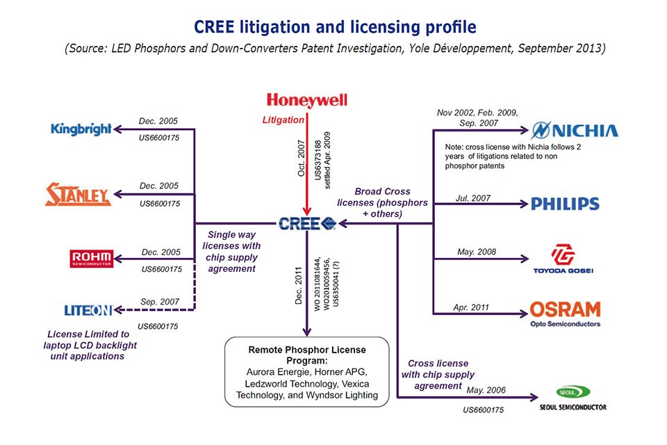 Phosphor IP is a major force in the LED industry. With more than 40 litigation cases, it is also used as leverage by companies which have negotiated close to 70 licensing and supply agreements to date. It can also be argued that in the first half of the 2000 decade, the strict enforcement and lack of license grants for some fundamental IP related to the design and manufacturing of white LEDs might also have slowed down the progress of the industry by preventing more efficient competition that would allow prices to decrease.