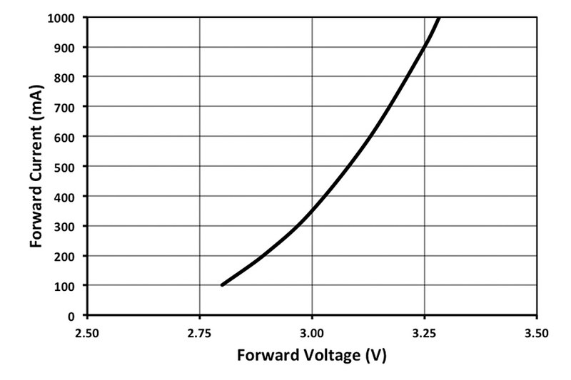 High brightness LEDs intended for lighting applications typically deliver optimum performance with a forward voltage of around 3V. However, as can be seen in figure 1, the relationship of voltage to current is non-linear so while the LED will start to turn on at a lower voltage it will rapidly draw a much higher current as the voltage increases above its nominal rating. Apart from considerations of heat dissipation and reliability (more on this below), this is inefficient since the relationship of luminous flux (a measure of light output) with LED current is also non-linear. So a doubling of current certainly does not result in twice the light output and a far better solution to achieve the desired light output is to use multiple LEDs.