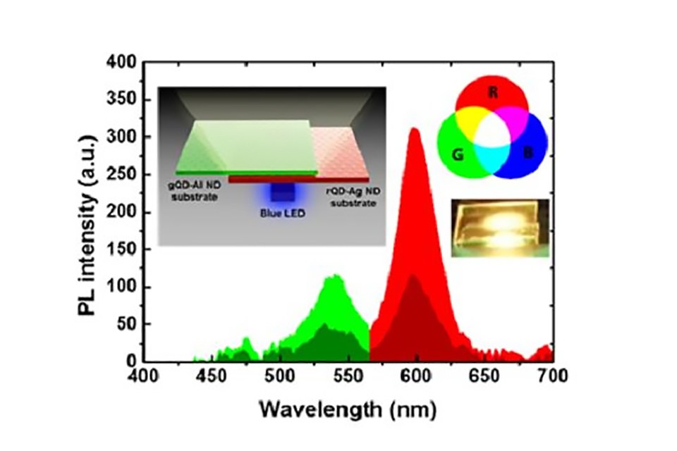 Professor Cho found the solution in a metallic nanostructure for lowering the production cost while improving the efficiency of QD LEDs. The team exploited the phenomenon of so-called surface plasmonic resonances when nanoscale metallic structures are exposed to light. Depending on the metal, the size, and the shape, the properties of metallic structures vary. The team used different metallic nanostructures for each QD LED - silver nanodisks for Red QDs and aluminum nanodisks for Green GDs - to make them more fluorescent.
